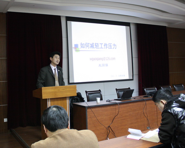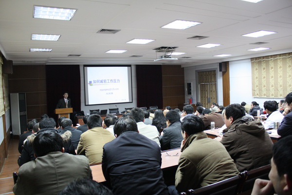 2011年3月4日下午,我所党委邀请精神卫生中心副院长王国强博士为我所在职党员、入党积极分子及班组长以上干部上了一堂题为“如何减轻工作压力”的党课。 王博士从压力来源入手阐述了职业倦怠的特点、因素、发生过程及表现形式;重点分析了医护人员的职业倦怠成因。王博士还为大家热心支招应对压力、预防倦怠。一是保持健康的身心和良好的适应力;二是自我调节——主动适应环境压力、勇于战胜精神挫折;三是营造和谐幸福的家庭氛围。两个小时的授课精彩纷呈,在场职工从中受益匪浅。