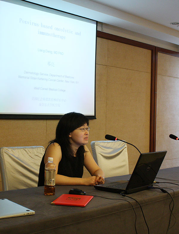 邓教授作了题为“Poxvirus-Based Oncolytic & Immunotherapy (痘病毒治疗癌症的机理)”的学术报告,简述痘病毒在癌症免疫治疗中的重要作用。结合药物治疗,该方法对于皮肤肿瘤杀灭率达25%以上,突破了传统的肿瘤治疗局限性,显著提高了患者存活率,应用前景光明。我所科技工作者对此产生了浓厚兴趣,争相提问,积极交流。