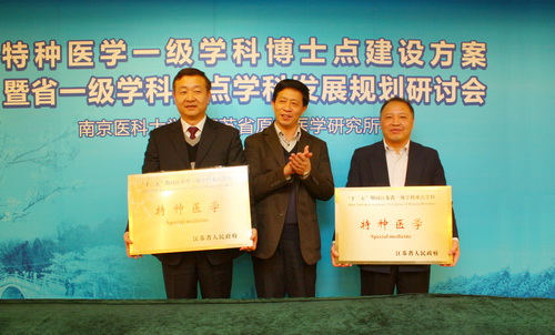 周建伟处长主持会议并宣读了《关于下达按<学位授予和人才培养学科目录>进行学位授权点对应调整结果的通知》、《省教育厅关于公布新增一级学科“十二五”省重点学科名单的通知》。胡刚副校长为特种医学学科带头人江苏省人民医院孙新臣教授和江苏省原子医学研究所罗世能所长授“特种医学”一级学科省重点学科铜牌。